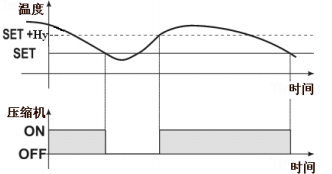 壓縮機輸出的狀態(tài)依據(jù)探頭測得的溫度,當溫度大于等于設定點(SET)+ 溫差( Hy)壓縮機輸出觸點閉合,壓縮機運轉(zhuǎn);當溫度小于等于設定點(SET)時壓縮機輸出觸點斷開,壓縮機停止運轉(zhuǎn)。