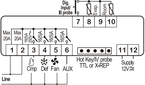 XR70CX:外形尺寸 32 x 74 x60 mm為適用于中/低溫強制風冷制冷系統(tǒng)微型溫度控制器,有四路輸出: 一路壓縮機、 一路蒸發(fā)器風扇和一路融霜(電熱或熱氣),還有 一路可以定義用于燈光、報警繼電器輸出、輔助輸出中的一種;提供了內(nèi)置實時時 鐘,每天最多可以設置6個融霜周期,還可按假日和工作日分開設定。“白天及夜晚”功能可設定兩個不同的設定值從而實現(xiàn)節(jié)能?梢蕴峁┳疃噙_四路NTC或PTC探 頭輸入: 一路為庫溫、一路為蒸發(fā)器溫度( 融霜終止溫度+風扇停止溫度控制),一路 可設置的無源數(shù)字開關(guān)量輸入也可以連接第三路溫度探頭輸入(為可選項,需要訂 貨時指明;可通過參數(shù)選擇是否使用);第四路探頭輸入(也可通過參數(shù)選擇是否 使用),連接在5針的熱鍵編程鑰匙接口的2、4號(左數(shù)或右數(shù)都可)端子上(需要 插接轉(zhuǎn)換器),可以用來測量冷凝溫度報警或者用來顯示某個點的溫度;熱鍵編程 接口可以連接編程鑰匙,還可以連接加裝XJ485-CX通訊轉(zhuǎn)換模塊接入到兼容ModBUS- RTU協(xié)議的網(wǎng)絡中去,例如DIXELL的XWEB系列監(jiān)控系統(tǒng)。
